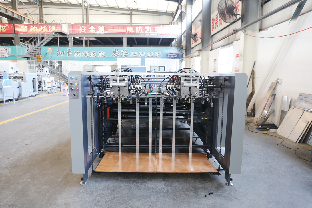 The machine uses double feeders to convey two sheets of paper for splicing to make paper bags, thus solving the problems of large paper bags that cannot be made due to various reasons, slow manual production and unstable quality. The machine adopts mechanical, optical, electrical and pneumatic integrated control. It is controlled by computer PLC programming, driven by servo motor, and is operated through an external programmable touch screen to realize human-machine interaction.